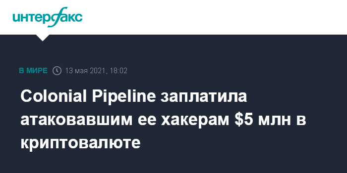 Москва. 13 мая. INTERFAX.RU - Компания-оператор американского трубопровода Colonial Pipeline заплатила около $5 млн хакерам за восстановление своей компьютерной сети, которую те парализовали 7 мая. Об этом сообщает агентство Bloomberg со ссылкой на источники.