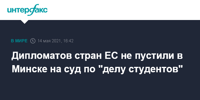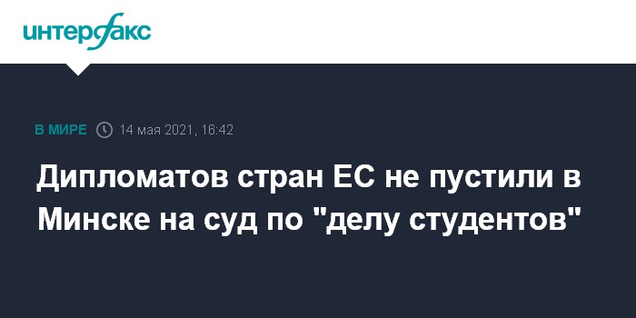 Москва. 14 мая. INTERFAX.RU - Дипломатам стран Европейского союза не удалось получить доступ в зал суда в белорусской столице, где судят студентов за участие в протестах после президентских выборов 2020 года.