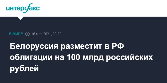 Москва. 15 мая. INTERFAX.RU - Белоруссия разместит в РФ облигации на 100 млрд российских рублей. Это предусмотрено указом №183 президента республики Александра Лукашенко, который опубликован на национальном правовом интернет-портале.