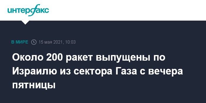 Москва. 15 мая. INTERFAX.RU - Порядка 200 ракет были выпущены боевиками из сектора Газа в сторону Израиля с вечера пятницы и в ночь на субботу, сообщает издание "Едиот ахронот" со ссылкой на заявление представителя Армии обороны Израиля.
