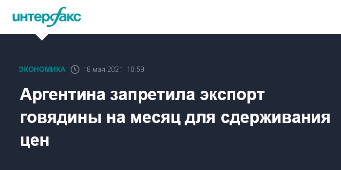 Москва. 18 мая. INTERFAX.RU - Правительство Аргентины ограничивает экспорт говядины - одного из основных товаров страны - в попытке сдержать неуклонный рост цен на внутреннем рынке.