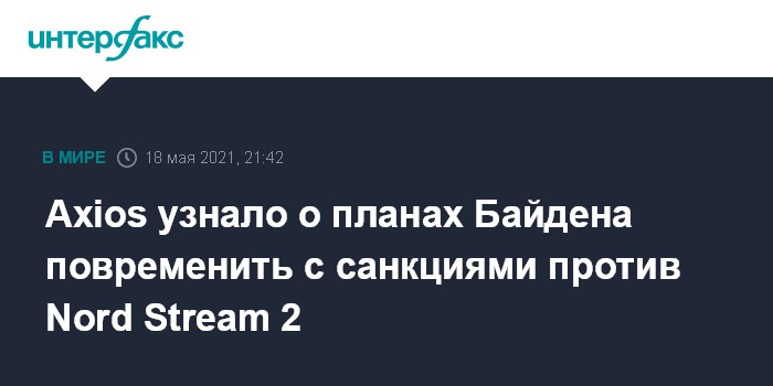 Москва. 18 мая. INTERFAX.RU - Администрация США отложит введение санкций против компании Nord Stream 2 AG, оператора газопровода "Северный поток 2", и ее руководителя Матиаса Варнига, пишет Axios со ссылкой на два информированных источника.