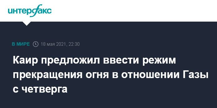 Москва. 18 мая. INTERFAX.RU - Египет через свои частные каналы предложил Израилю учредить режим прекращения огня в отношении сектора Газа с 06:00 утра в четверг по местному времени, сообщает во вторник 12-й канал израильского телевидения.