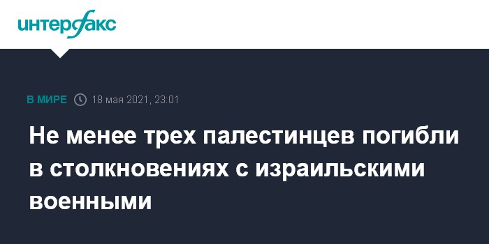 Москва. 18 мая. INTERFAX.RU - По меньшей мере три палестинца погибли на Западном берегу реки Иордан в результате столкновений с военными Израиля, произошедших в ходе протестов палестинцев против израильских действий в секторе Газа и Иерусалиме, сообщает издание The Times of Israel.