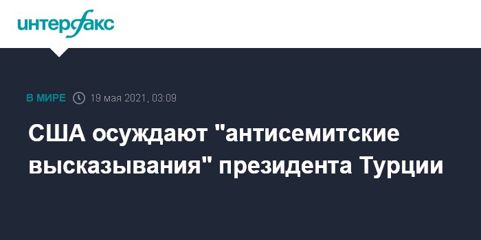 Москва. 19 мая. INTERFAX.RU - США осуждают "антисемитские высказывания" президента Турции Реджепа Тайипа Эрдогана и призывают воздерживаться от них.
