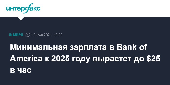 Москва. 19 мая. INTERFAX.RU - Bank of America Corp., второй по объему кредитования американский банк, планирует поднять минимальную почасовую заработную плату сотрудникам в США до $25 к 2025 году. Это ему позволит превзойти своих конкурентов по оплате труда на фоне дефицита рабочих кадров по всей стране, отмечает The Wall Street Journal.