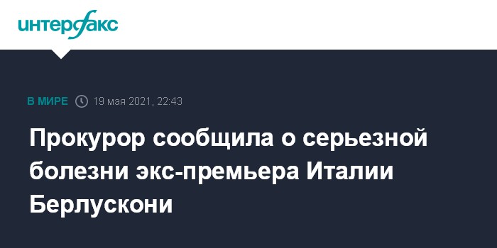 Москва. 19 мая. INTERFAX.RU - Итальянский прокурор Тициана Сицилиано заявила о серьезной болезни бывшего председателя совета министров страны Сильвио Берлускони, в отношении которого миланский суд ведет процесс по обвинению во взяточничестве. Ее заявление приводит агентство ANSA.
