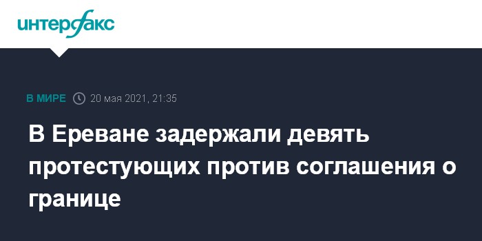 Москва. 20 мая. INTERFAX.RU - Полиция Армении задерживает в центре Еревана участников акции протеста против планируемого подписания нового соглашения с Азербайджаном о демаркации и делимитации границ.