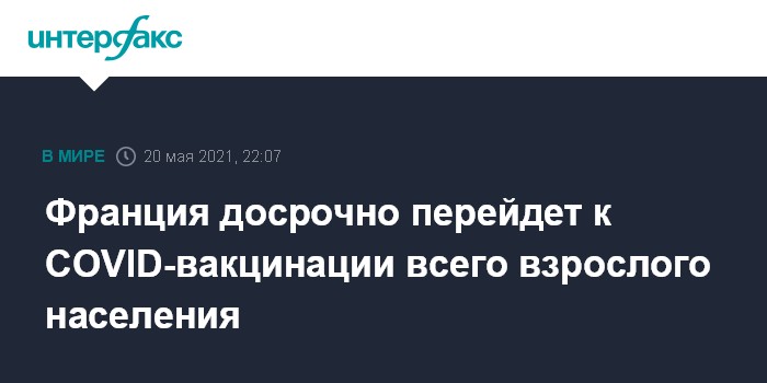 Такое ускорение графика предпринимается после того как Франция 15 мая преодолела порог в 20 млн человек, получивших хотя бы одну дозу вакцины. Ближайшая цель правительства достичь цифры в 30 млн человек, привитых первой дозой, к 15 июня.