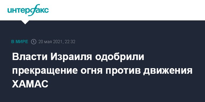 Москва. 20 мая. INTERFAX.RU - Израильский кабинет по вопросам безопасности в четверг поддержал решение о прекращении огня против палестинского движения ХАМАС в секторе Газа. Об этом сообщает издание Times of Israel со ссылкой на заявление офиса премьера Израиля Биньямина Нетаньяху.