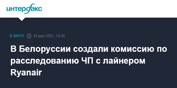 Москва. 24 мая. INTERFAX.RU - В Белоруссии создана комиссия по расследованию инцидента с самолетом Ryanair, сообщили агентству "Интерфакс-Запад" в пресс-службе республиканского Минтранса.