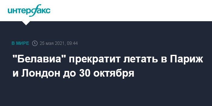 Москва. 25 мая. INTERFAX.RU - Белорусская авиакомпания "Белавиа" прекратит летать в Париж и Лондон из-за запрета властей Франции и Великобритании использовать аэропорты этих стран.