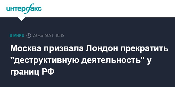 Москва. 26 мая. INTERFAX.RU - Москва призывает Великобританию прекратить деструктивную и дестабилизирующую деятельность у российских границ, заявила официальный представитель МИД РФ Мария Захарова.