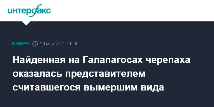 Москва. 26 мая. INTERFAX.RU - Генетические тесты подтвердили, что найденная на Галапагосских островах гигантская черепаха относится к виду, который, как считали раньше ученые, вымер более ста лет назад.
