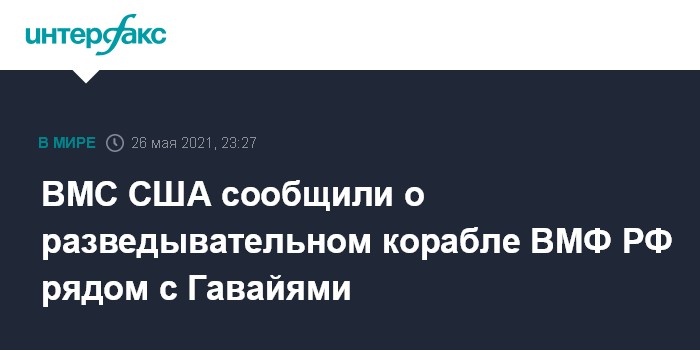 Москва. 26 мая. INTERFAX.RU - Последние несколько дней разведывательный корабль ВМФ России находится к западу от Гавайских островов, сообщил представитель ВМС США информационной службе Военно-морского института Соединенных Штатов.