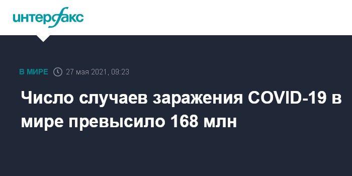 Москва. 27 мая. INTERFAX.RU - Число зарегистрированных случаев инфицирования COVID-19 в мире на утро четверга составило 168 197 107, сообщает американский университет Джонса Хопкинса.