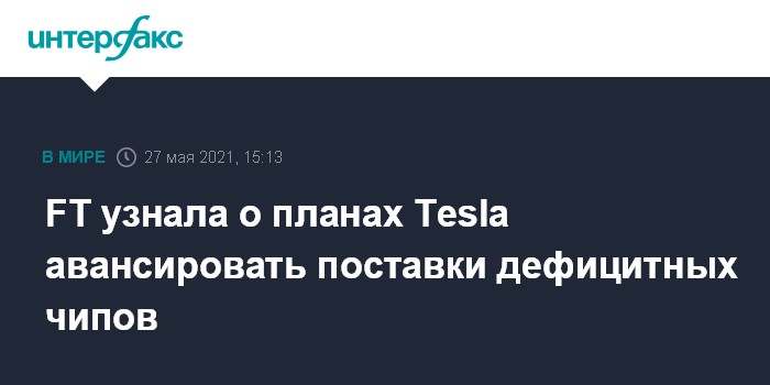 Москва. 27 мая. INTERFAX.RU - Производитель электромобилей Tesla Inc. может начать вносить авансовые платежи, чтобы гарантировать поставки чипов в условиях глобального дефицита полупроводников, пишет Financial Times со ссылкой на осведомленные источники.