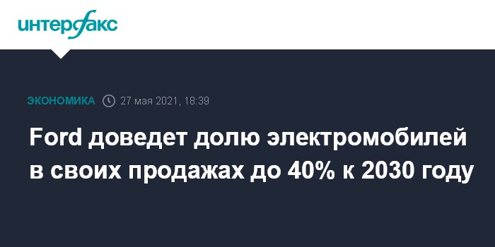 Москва. 27 мая. INTERFAX.RU - Американский автопроизводитель Ford Motor Co. намерен довести долю электромобилей в своих глобальных продажах до 40% к 2030 году. Об этом руководители компании объявили на онлайн-презентации.