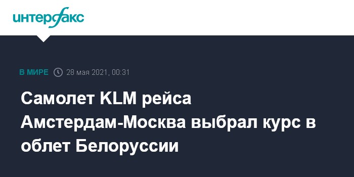 Москва. 28 мая. INTERFAX.RU - Самолет нидерландской авиакомпании KLM, выполняющий вывозной рейс, минуя территорию Белоруссии, вылетел из Амстердама в Москву.