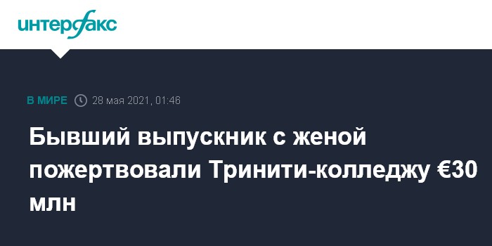 Москва. 28 мая. INTERFAX.RU - Тринити-колледж в Дублине получил пожертвование в размере €30 миллионов (около 27 млрд руб.) от бывшего выпускника и его жены, сообщает BBC News.
