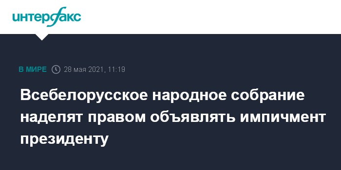 "Предлагается перераспределить полномочия парламента к всебелорусскому народному собранию по импичменту, то есть возможному смещению с должности президента республики Белоруссия. Президент может быть смещен с должности в связи с совершением государственной измены или иного тяжкого преступления", - сказал Миклашевич в пятницу на заседании конституционной комиссии в Минске.