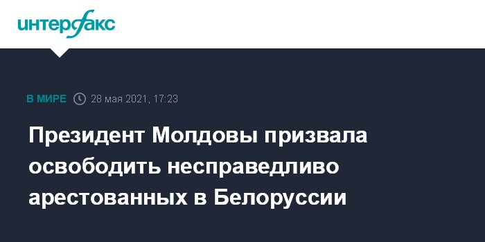 Москва. 28 мая. INTERFAX.RU - Президент Молдовы Майя Санду выразила озабоченность судьбой людей, "несправедливо арестованных в Беларуси".