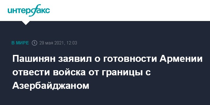 Москва. 29 мая. INTERFAX.RU - Армения готова в любой момент отвести свои войска от границы с Азербайджаном и ожидает отвода азербайджанских войск с территории Армении, заявил в субботу и.о. премьера Армении Никол Пашинян.