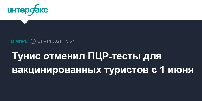 Москва. 31 мая. INTERFAX.RU - Власти Туниса с 1 июня отменяют требование справки с отрицательным результатом ПЦР-теста на коронавирус для туристов с прививкой, включая вакцинацию "Спутником V", сообщает Национальный офис по туризму страны.