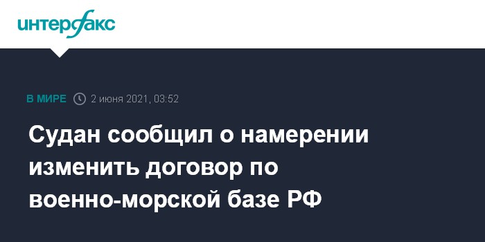 Москва. 2 июня. INTERFAX.RU - Судан намерен пересмотреть соглашение с Россией по военно-морской базе, сообщил начальник Генерального штаба ВС Судана Мохаммед Осман аль-Хусейн в интервью телеканалу Blue Nile.