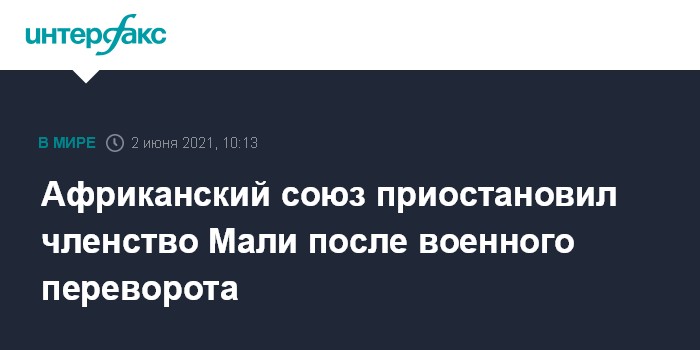 Москва. 2 июня. INTERFAX.RU - Африканский союз приостановил членство Мали в составе организации в связи с произошедшим на прошлой неделе военным переворотом и пригрозил ввести санкции, сообщает Deutsche Welle.