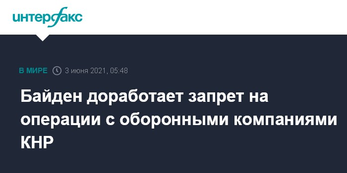 Москва. 3 июня. INTERFAX.RU - Президент США Джо Байден планирует расширить подготовленный экс-президентом Дональдом Трампом список китайский компаний, связанных с вооруженными силами КНР, с которыми американским фирмам под угрозой финансовых санкций будет запрещено вести дела, сообщило агентство Bloomberg.
