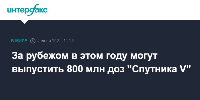 Москва. 4 июня. INTERFAX.RU - Зарубежные площадки готовы в этом году произвести 800 млн двухкомпонентных доз вакцины от COVID-19 "Спутник V", сообщил глава Российского фонда прямых инвестиций (РФПИ) Кирилл Дмитриев.