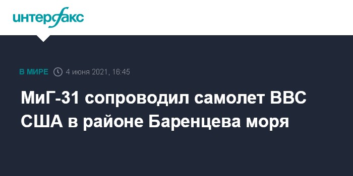 Москва. 4 июня. INTERFAX.RU - Российские военные поднимали в воздух перехватчик МиГ-31 для сопровождения американского военного самолета-разведчика в районе Баренцева моря, сообщил Северный флот.