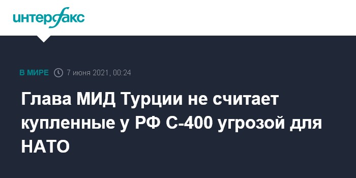 Москва. 7 июня. INTERFAX.RU - Зенитные ракетные системы (ЗРС) С-400, купленные Турцией у России, не представляют опасности для НАТО, заявил глава турецкого МИД Мевлют Чавушоглу.