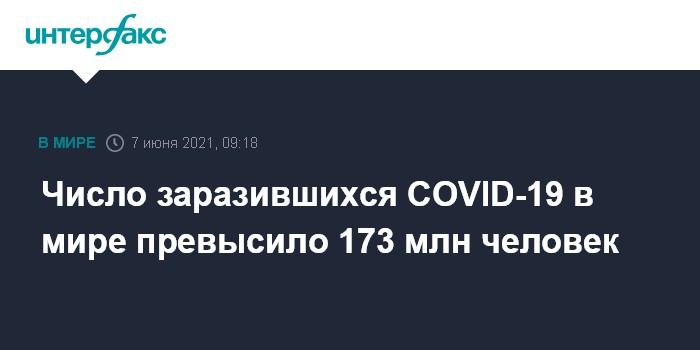 Москва. 7 июня. INTERFAX.RU - Число зарегистрированных случаев заражения коронавирусом COVID-19 в мире на утро понедельника составило 173 313 786, сообщил американский университет Джонса Хопкинса.