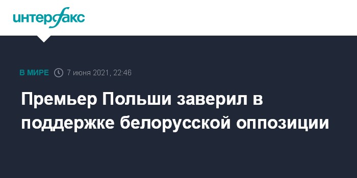 Москва. 7 июня. INTERFAX.RU - Премьер Польши Матеуш Моравецкий в понедельник заявил, что Варшава продолжает поддерживать белорусскую оппозицию на фоне критики однопартийца Рышарда Терлецкого в адрес Светланы Тихановской, сообщает Associated Press.