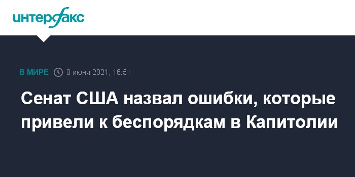 Москва. 8 июня. INTERFAX.RU - Сенат США во вторник опубликовал двухпартийный доклад, в котором, в частности, говорится, что к беспорядкам в здании Капитолия 6 января привели ошибки властей, военных и сил безопасности, сообщает агентство Associated Press (AP).