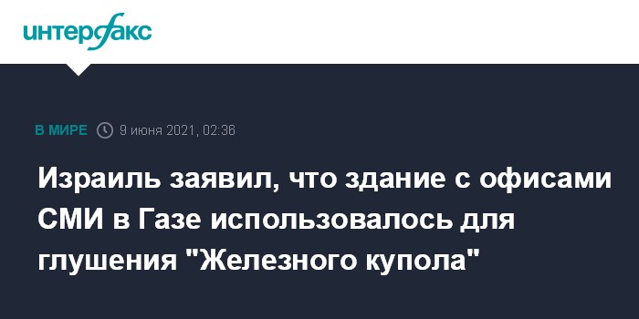 Москва. 9 июня. INTERFAX.RU - Израиль заявляет, что здание СМИ, разрушенное одним из его авиаударов во время недавнего конфликта в Газе, использовалось боевиками ХАМАС для попытки глушить израильскую систему противоракетной обороны "Железный купол", передает BBC News.