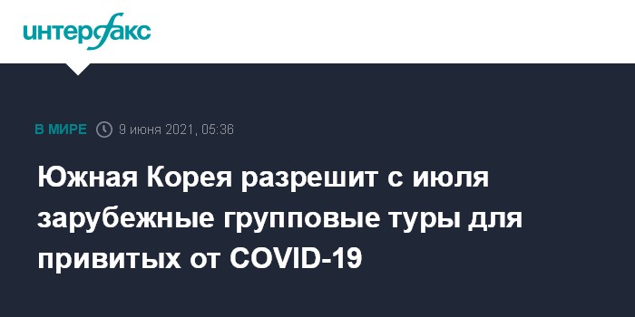 Москва. 9 июня. INTERFAX.RU - Южная Корея разрешит зарубежные групповые поездки полностью вакцинированных граждан в страны со стабильными мерами реагирования на COVID-19 уже в июле, заявил премьер-министр Ким Бу Гем в среду.
