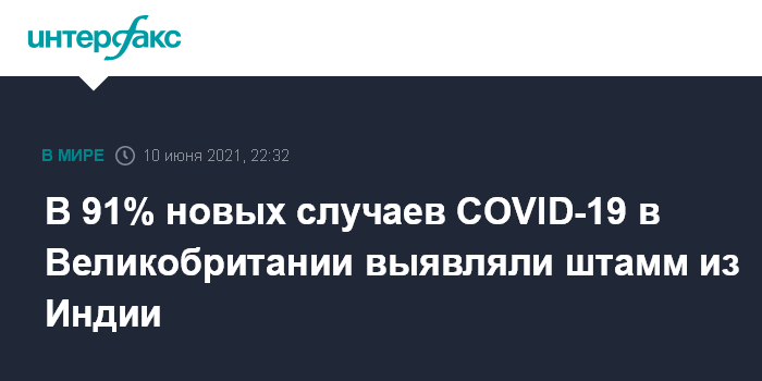 Москва. 10 июня. INTERFAX.RU - В Великобритании 91% новых случаев COVID-19 составляют заражения индийским штаммом коронавируса, которому в ВОЗ дали название "Дельта", сообщает телеканал Sky News со ссылкой на главу британского Минздрава Мэтта Хэнкока.