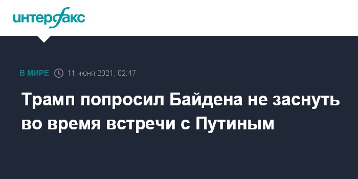Москва. 11 июня. INTERFAX.RU - Бывший президент США Дональд Трамп попросил президента Джо Байдена не заснуть во время встречи с президентом России Владимиром Путиным и передать ему "самые теплые пожелания".