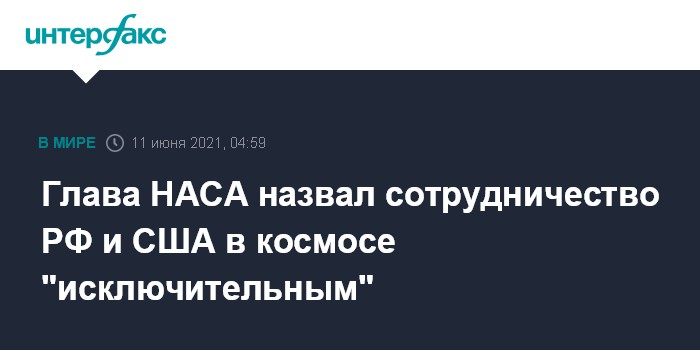 Москва. 11 июня. INTERFAX.RU - Глава американского аэрокосмического агентства НАСА Билл Нельсон назвал сотрудничество России и США в космосе "исключительным", об этом он рассказал в интервью изданию Politico.