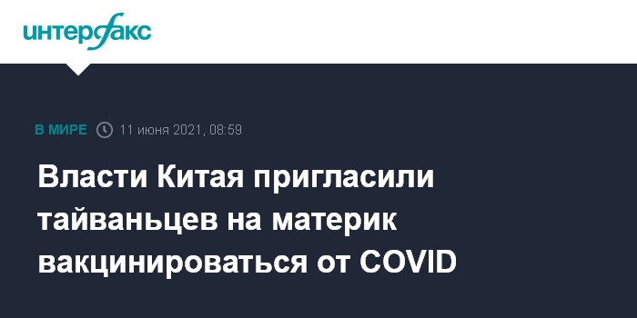 Москва. 11 июня. INTERFAX.RU - Жители острова Тайвань могут приехать на материк, чтобы вакцинироваться от коронавируса, сообщил журналистам в пятницу официальный представитель Канцелярии по делам Тайваня Госсовета КНР Ма Сяогуан.