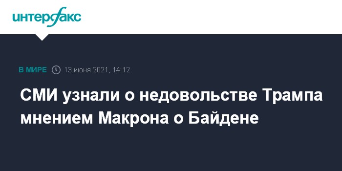 Москва. 13 июня. INTERFAX.RU - Бывшему президенту США Дональду Трампу пришлись не по душе хвалебные комментарии президента Франции Эммануэля Макрона о нынешнем американском лидере Джо Байдене, пишет в воскресенье французская газета Le Figaro.