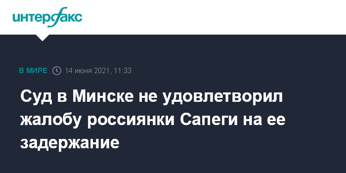 Москва. 14 июня. INTERFAX.RU - Суд Партизанского района Минска не удовлетворил жалобу гражданки России Софьи Сапеги на ее задержание.