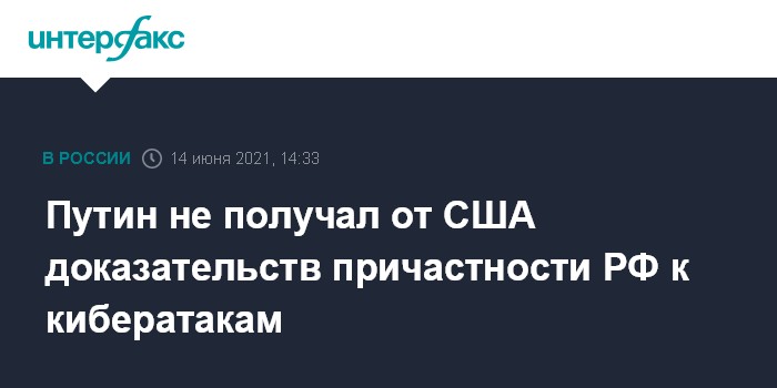 Москва. 14 июня. INTERFAX.RU - США, обвиняя Россию в кибератаках, не представили никаких доказательств, заявил российский президент Владимир Путин в интервью телеканалу NBC.