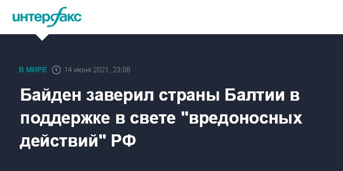Ранее в понедельник Белый дом сообщил, что Байден вместе с лидерами Эстонии, Латвии и Литвы заявил о приверженности совместной работе в рамках НАТО по реагированию на действия со стороны России и Китая.