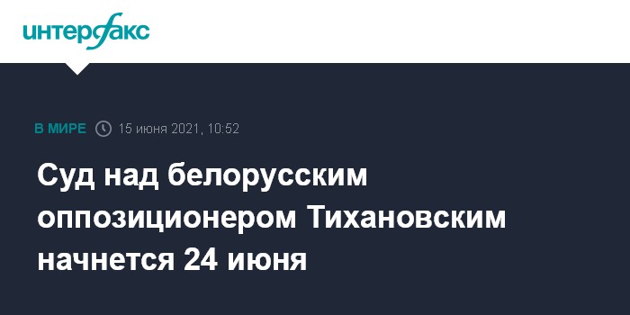 Москва. 15 июня. INTERFAX.RU - Суд над белорусским оппозиционером и блогером, мужем экс-кандидата в президенты страны Светланы Тихановской Сергеем Тихановским начнется 24 июня, сообщила "Интерфаксу" во вторник его адвокат Наталья Мацкевич.