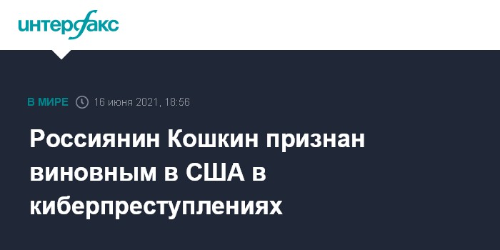 Москва. 16 июня. INTERFAX.RU - Жюри присяжных в суде американского штата Коннектикут признало виновным в совершении киберпреступлений гражданина России Олега Кошкина. Об этом говорится в распространенном в среду пресс-релизе минюста США.