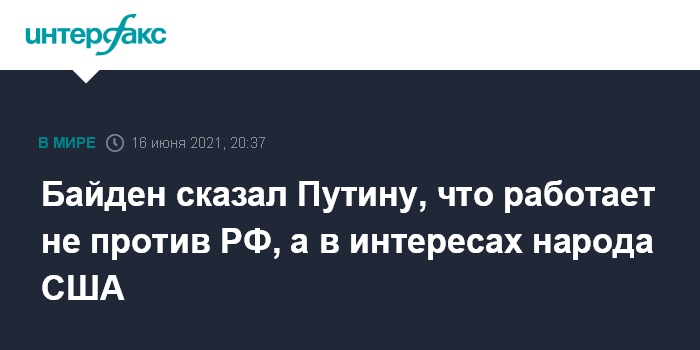 Москва. 16 июня. INTERFAX.RU - Президент США Джо Байден заявил своему российскому коллеге Владимиру Путину, что его работа направлена не против России, а нацелена на интересы американского народа.